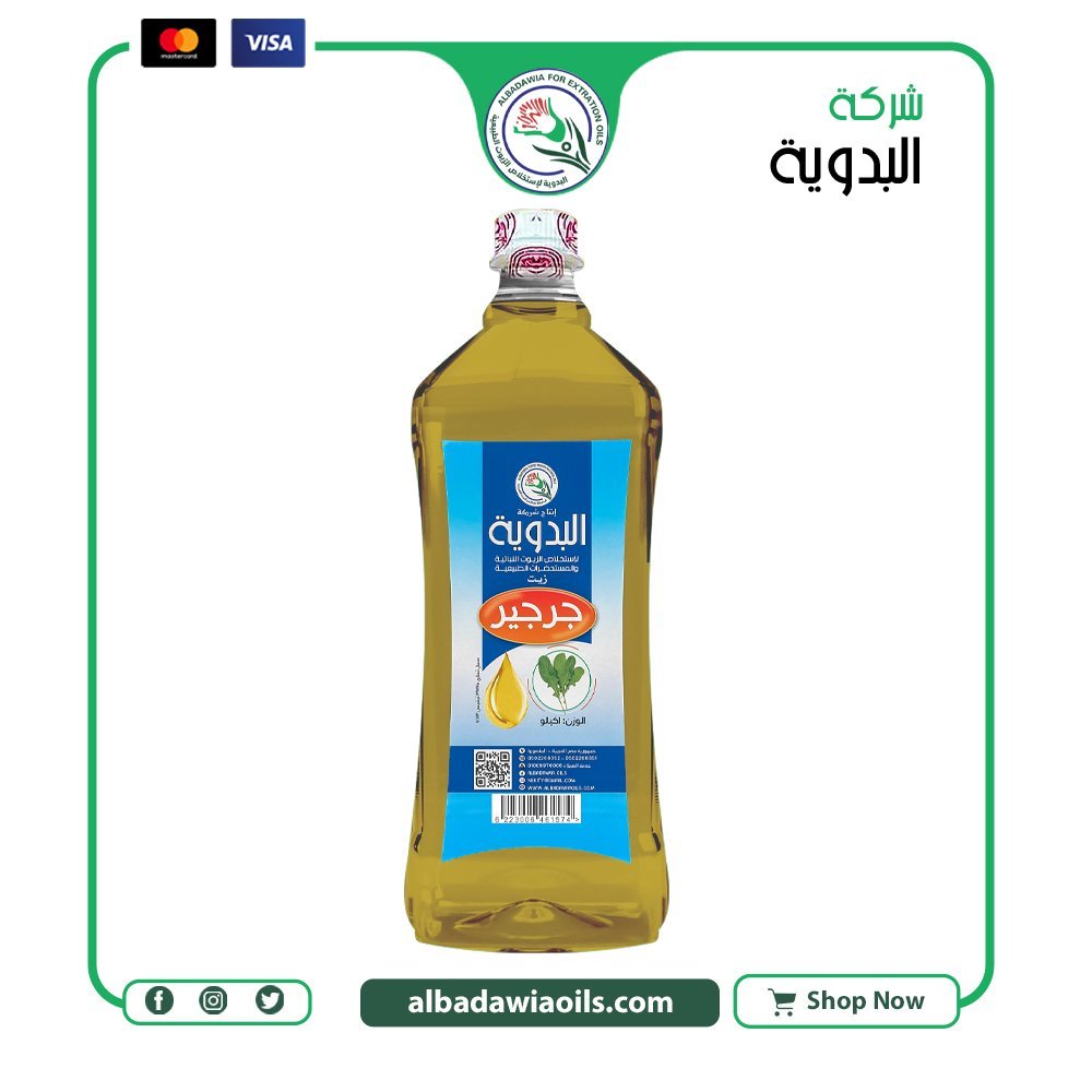 زيت جرجير 1 كيلو حجم اقتصادي من معاصر البدوية مناسب للاستخدام المتكرر في العناية أو التصنيع أو الاستخدام التجاري حسب طبيعة المنتج.