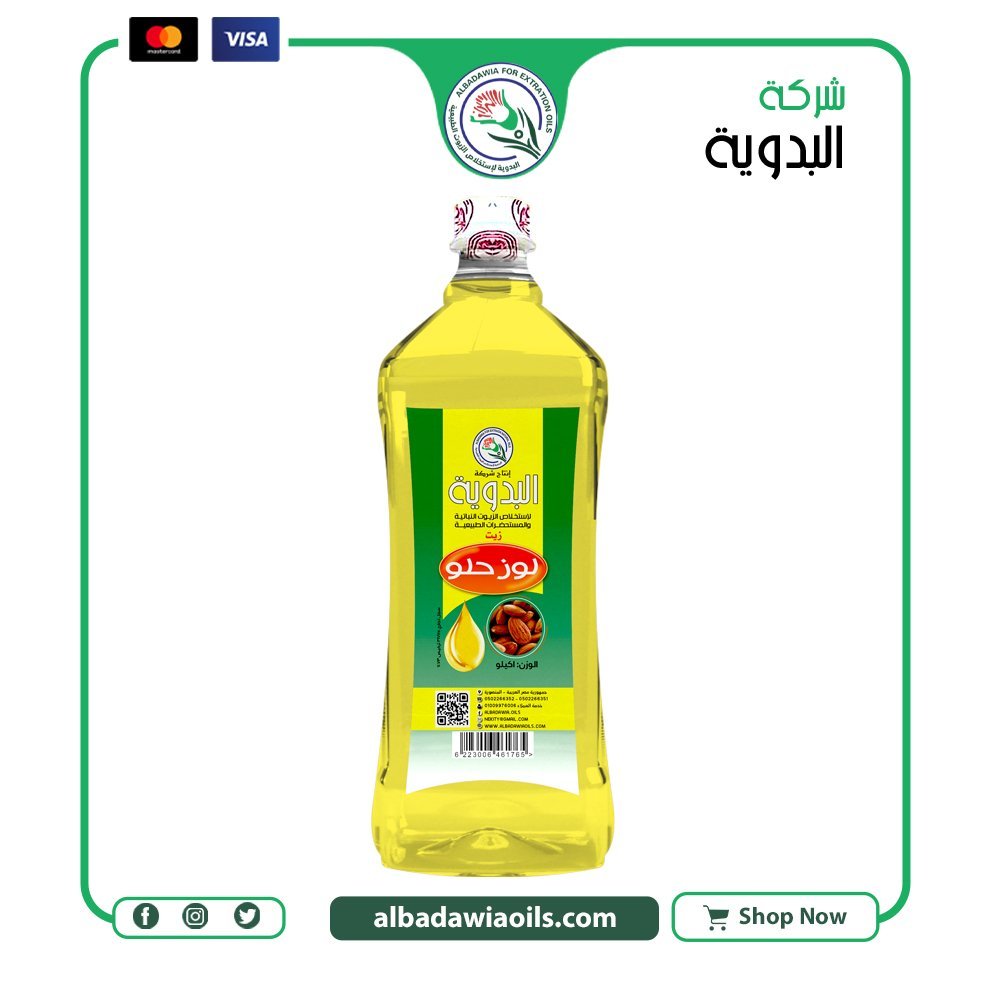 زيت لوز حلو 1 كيلو حجم اقتصادي من معاصر البدوية مناسب للاستخدام المتكرر في العناية أو التصنيع أو الاستخدام التجاري حسب طبيعة المنتج.