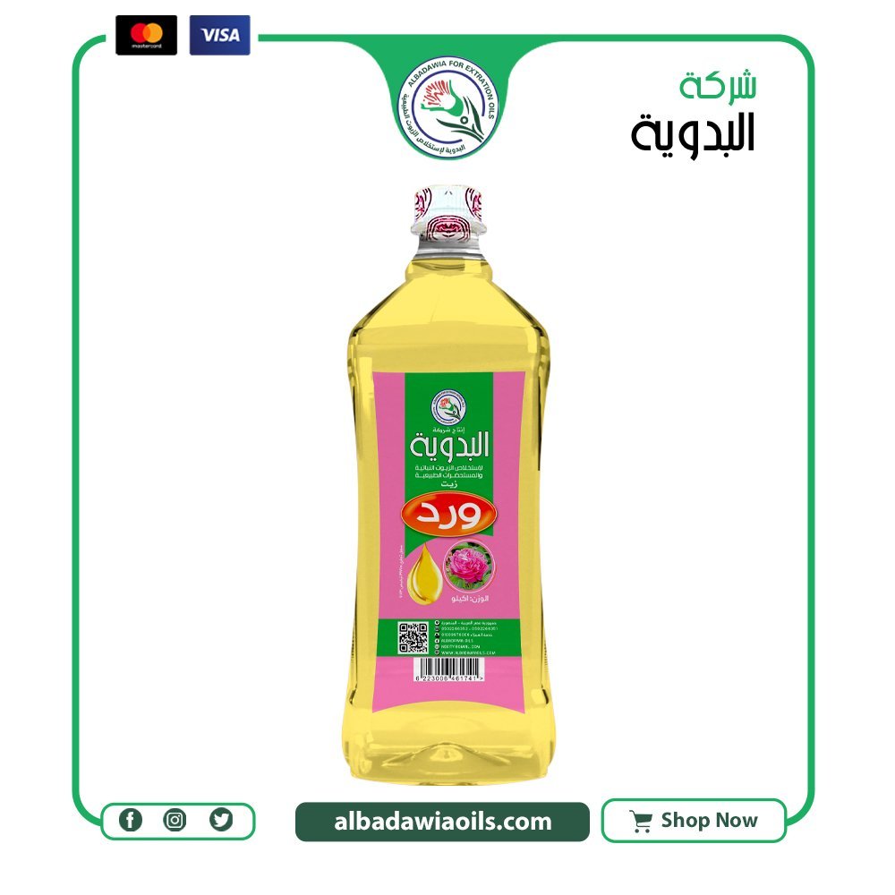 زيت ورد 1 كيلو حجم اقتصادي من معاصر البدوية مناسب للاستخدام المتكرر في العناية أو التصنيع أو الاستخدام التجاري حسب طبيعة المنتج.