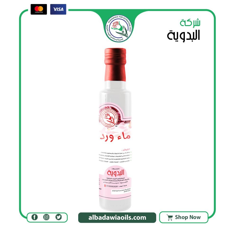 ماء ورد 250 مل منتج غذائي من معاصر البدوية مناسب للاستخدام اليومي في المطبخ والوصفات المختلفة.